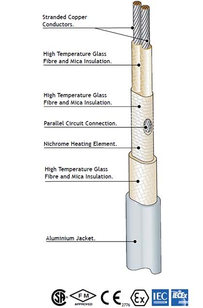 PowerHeat AHT is jacketted in a continuous aluminium extrusion for maximum mechanical strength. The aluminium jacket allows the cable to be formed around valves, pumps and instruments.