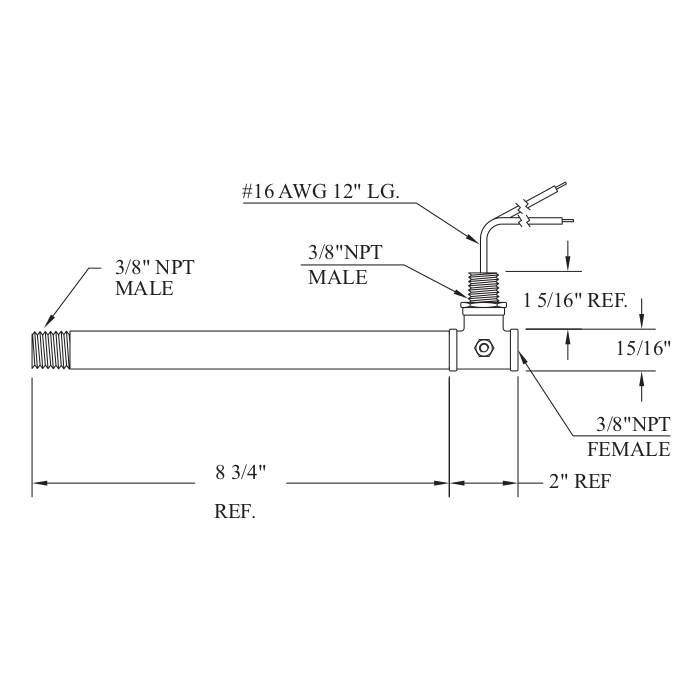 The Style 007 Fluid Heater uses the same element configuration as the Styles 001 and 003 but in a stainless steel pipe. This construction is suited to in-line applications where pipe threads are required at both inlet and outlet ends. Electrical terminations are offered in the form of low pressure lead wires, rated up to 20 psi, or in the form of high pressure feedthrus, rated up to 150 psi. These heaters can be used to heat substances other than air as long as the fluid is non-conductive and does not chemically react with 300 series stainless steel, silver solder, nickel, aluminum oxide or the epoxy potting material used on the leaded model. This product must be properly grounded and fused.