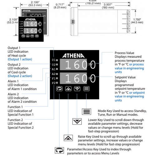 The Athena 16C is a 1/16 DIN panel mounted, auto tuning controller that can be used for precise control of a single loop with two independent outputs field configurable as direct acting, reverse acting or alarm. RS-232 or RS-485 communications interfaces are available, and two digital LED displays provide visual indication of various control functions.