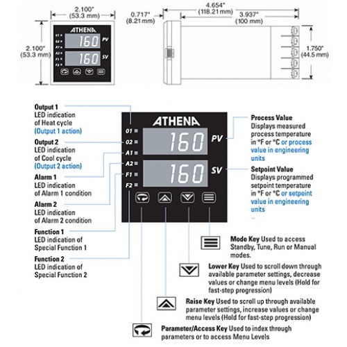 The Athena Legacy Series 16 is a 1/16 DIN panel mounted, auto-tuning digital temperature process controller. It offers precise control of a single loop with two independent outputs.